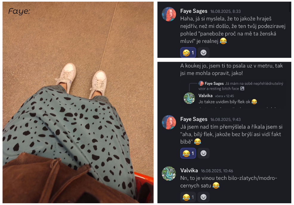 Valvika: Nemáš si na sebe brát modro-černý šaty! Nebo byly bílo-zlatý? Už zase nevím! – máchá dramaticky rukama – Ale jsem ráda, že sis mě odchytla, i když jsem se se zdvořilým úsměvem odvrátila a pokračovala dál v chůzi, protože nevím teda, s kým jiným bych pak tu famfrhru vymýšlela.